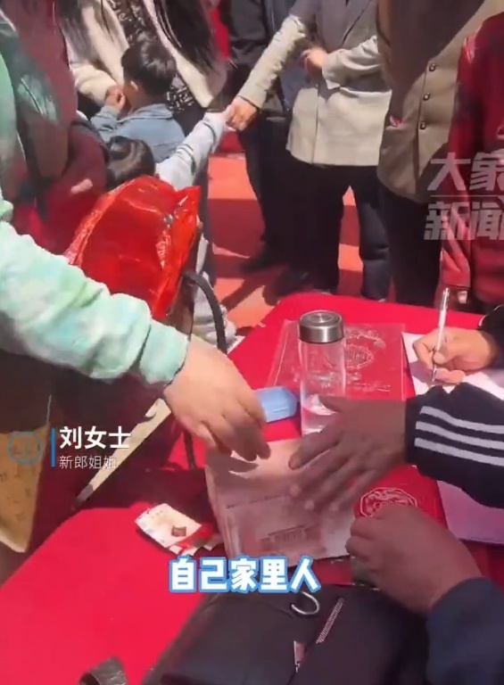 视频显示,婚礼现场,一名女子从包里拿出厚厚一叠人民币,脸上喜气洋洋。