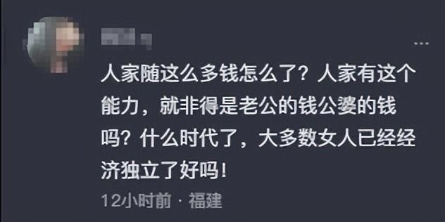 也有网友表示,“人家随这么多钱怎么了?人家有这个能力,就非得是老公的钱公婆的钱吗?什么时代了,大多数女人已经经济独立了好吗!”