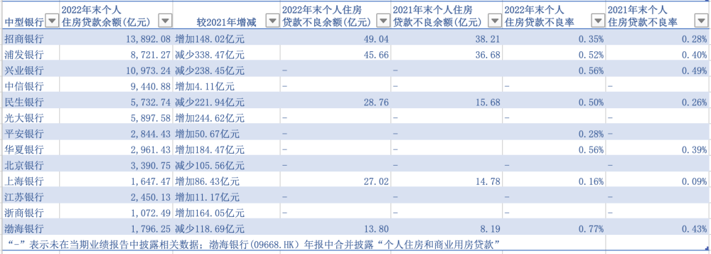 13家上市中型银行中,2022年有5家出现了个人住房贷款余额下降,分别是兴业银行、浦发银行、民生银行、北京银行和渤海银行。