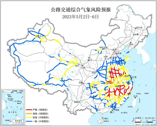 江南、华南北部等地自北向南有中到大雨,湖南中部、江西中部、浙江西部、福建北部等地暴雨,局地大暴雨。此外,预计本轮降雨过程中,四川、重庆、贵州、湖南、湖北、安徽、江苏、浙江等地将有强对流天气,以短时强降水为主,并伴有雷电、8~10级雷暴大风、冰雹等天气,此次强降雨过程正值假期返程高峰。据预测,2日至6日江苏、安徽、河南、湖北、浙江、福建、江西、湖南、山东等地,境内高速公路部分路段较易出现低能见度、道路湿滑和积水等现象,交通安全隐患和道路拥堵风险加大,提醒大家密切关注天气预报,合理安排出行计划。