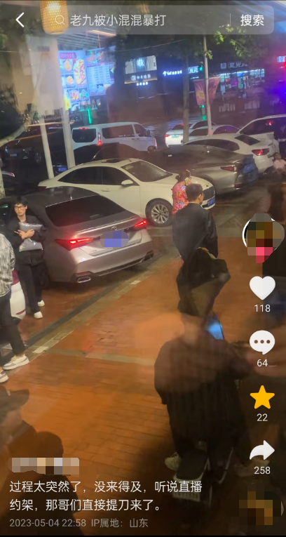 5月4日晚,有数位网友爆料,在山东青岛即墨区一饭店门口,发生一起当街砍人事件。视频中一名黑衣男子持长刀砍向白衣男子。有网友称,被砍白衣男子疑似当地网红“xx老九”周某某。