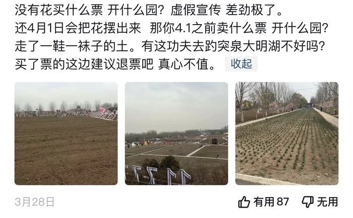 “今年3月底我买了一处郁金香花海景区的门票,实际去了发现全是黄土地,跟视频里宣传的完全不是一码事。我问工作人员原因,对方说郁金香还没开出来。”网友刘女士告诉新黄河记者,她此前就曾遇到过跟宣传视频截然不符的景区。