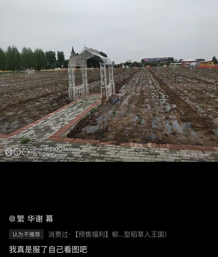 根据刘女士提供的照片可以看到,她“种草”的景区使用了疑似合成的视频进行宣传。视频内,大片郁金香开得郁郁葱葱,后方还有两个巨大的草莓熊玩偶。然而,网友在该景区评论区晒出的照片却显示,景区内一株郁金香都没有开放。“景区这种行为真的非常败好感,我拿出一个周末大老远跑去玩,收获到的就是一堆乱糟糟的黄土”,刘女士坦言,她再也不会来这处景区打卡。