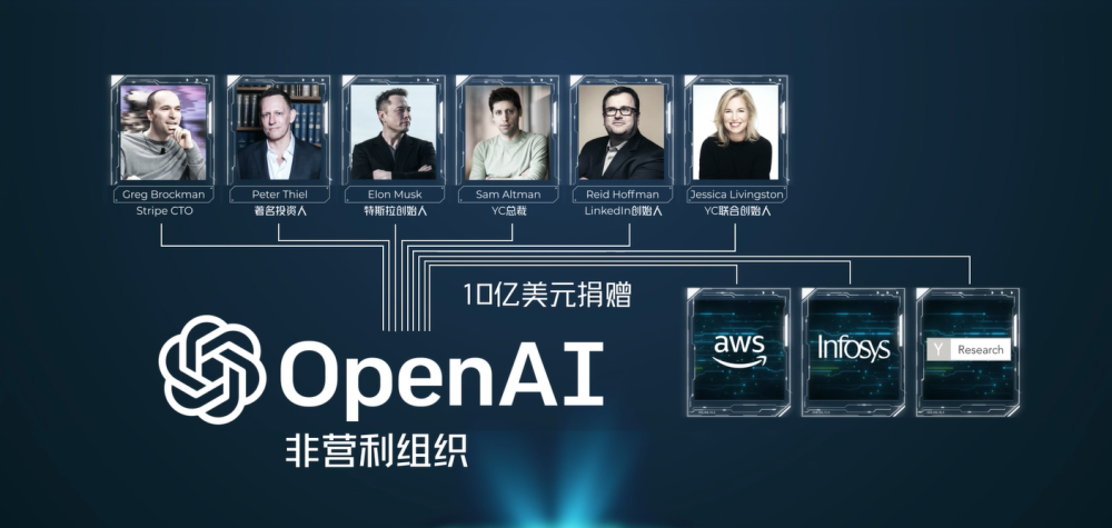 至此OpenAI成立了。2015年底,YC总裁Sam Altman、Strip前CTO Greg Brockman、LinkedIn创始人Reid Hoffman、YC联合创始人Jessica Livingston、著名投资人Peter Thiel、特斯拉创始人Elon Musk、亚马逊AWS、Infosys公司和YC Research宣布成立OpenAI,并承诺给这家非营利组织机构投资超过 10 亿美元。由于OpenAI的非营利组织形式,没有人拥有公司任何股份或权益,而公司的财产和收入永远不会派发给任何捐赠人或业主。OpenAI表示,将通过向公众开放其专利和研究,并且会与其他机构和研究人员“自由合作”。听上去是不是很理想主义、非常乌托邦?最开始确实挺振奋人心的,但很快,OpenAI内部冲突四起。