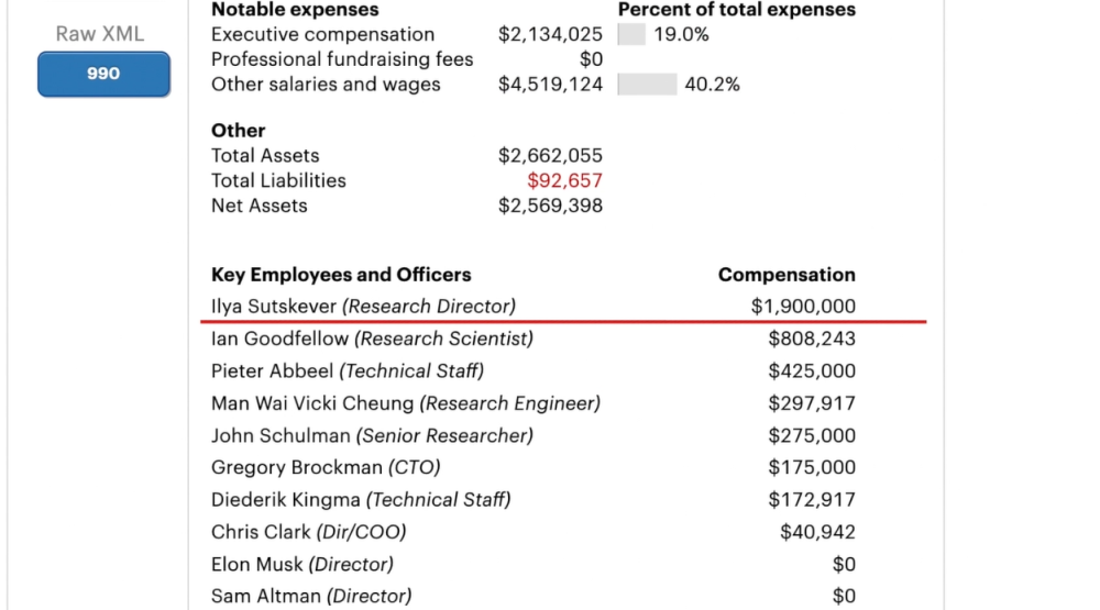 根据OpenAI的税务文件显示,给首席技术官Ilya Sutskever的薪水是大概190万美元,另外一个首席研究员Ian Goodfellow是80万美元,这两人都是从谷歌挖过来的,虽然当年他们的薪水公布之后是引发了一些舆论争议,觉得在非营利组织里面这个公司太高了。但是,这个薪水和他们在谷歌时期的薪水相比,下降得不是一点半点。