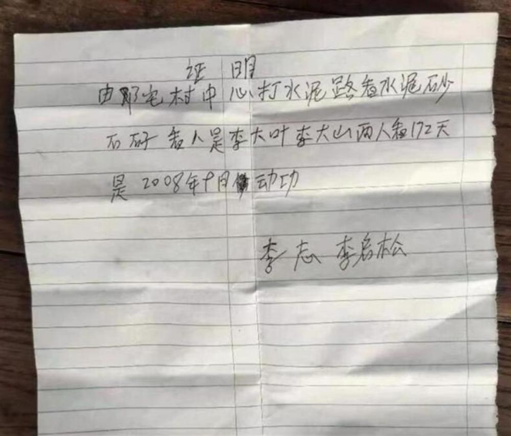 网友发布的视频中还有一张证明,证明称:“由邓宅村中心打水泥路看水泥、砂石、石子,看人是李大叶、李大山,两人看172天,是2008年9月动工。”落款署名是李志和李启松。