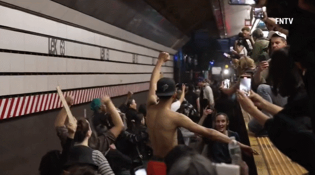 抗议活动迫使一辆进站的Q线列车在入站处紧急制动。视频中可以听到当地警察试图维持秩序。