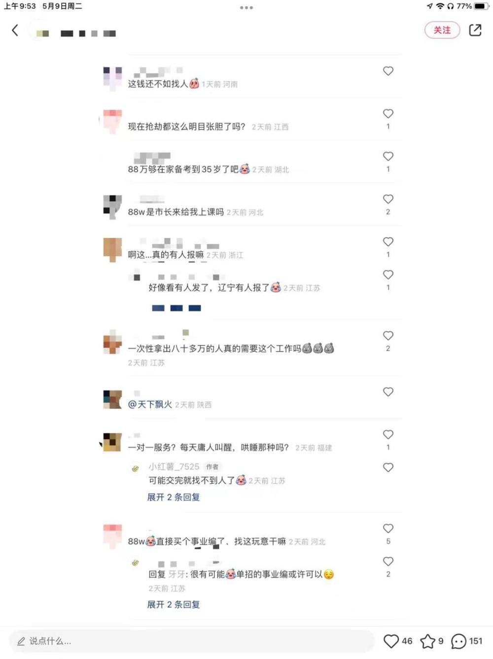上述“高端定制课”的宣传海报迅速引发热议。澎湃新闻注意到,小红书上有关“88.8万定制课”的帖子已经删除。与此同时,有网友称“辽宁已有人报考该课程”。