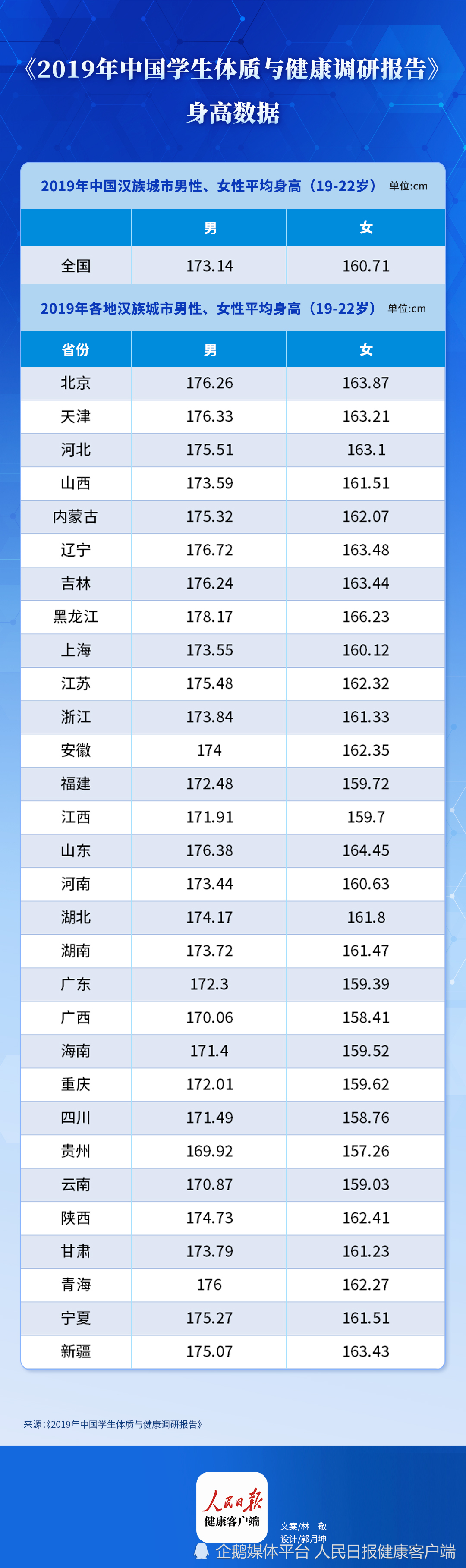 那么山东人的身高在全国中处于什么水平呢?人民日报健康客户端查询,根据高等教育出版社出版的《2019年中国学生体质调研报告》,19-22岁我国城市男生平均身高173.99厘米,城市女生是161.41厘米。