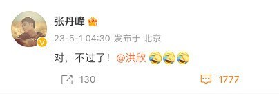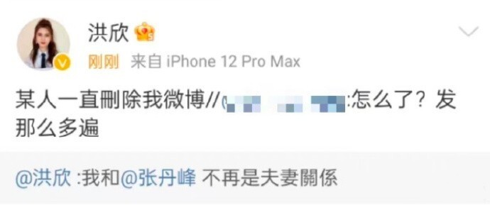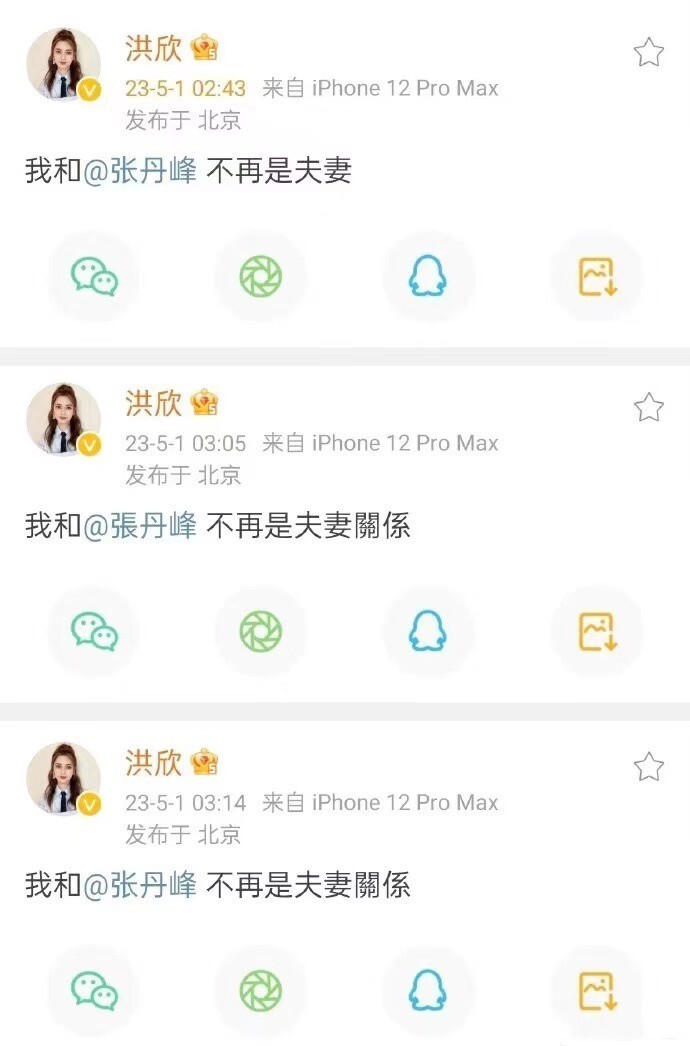 之所以说疑似,因为洪欣那句“我和张丹峰不再是夫妻”的微博最早发表于5月1日的凌晨2点43分;她从2点43到3点14之间连发三次。网友问她为啥发那么多遍,她回复说:因为某人一直删除我微博。然后,张丹峰在4点30回复说“对,不过了”,附送三个捂脸挥泪的表情。