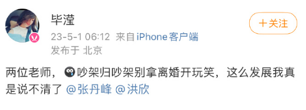 到了6点42分,从2018年起就被网友认定是张丹峰出轨对象的经纪人毕滢也发了条微博:两位老师,吵架归吵架别拿离婚开玩笑,这么发展我真是说不清了。也附送崩溃表情包一枚。
