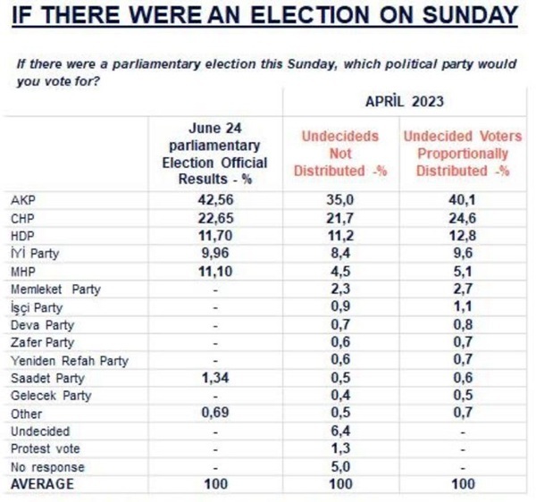 土耳其民调机构Metropoll的调查显示,科勒齐达奥卢在第一轮投票中将获得42.6%选票,高于埃尔多安的41.1%,因斯则以5%排名第三。但在议会选举中,执政党正发党依然将领先议会第二大党共和人民党和第三大党人民民主党。