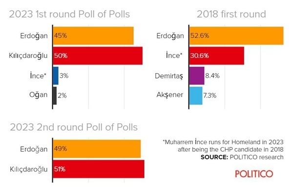 政治新闻网的民调则显示科勒齐达奥卢将在第一轮投票中拿下50%选票,埃尔多安45%,因斯3%;第二轮投票中,科勒齐达奥卢将以51%的得票击败埃尔多安。