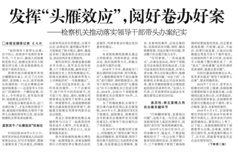 2019年8月,《检察日报》头版曾刊发《发挥“头雁效应”,阅好卷办好案》一文。