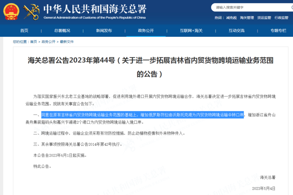 据海关总署网站消息,近日,海关总署联合三部委批复同意吉林省进一步扩大内贸货物跨境运输业务范围,增加俄罗斯符拉迪沃斯托克港(海参崴港)作为内贸货物中转口岸,浙江省舟山甬舟集装箱码头和嘉兴乍浦港作为内贸货物跨境运输入境口岸。