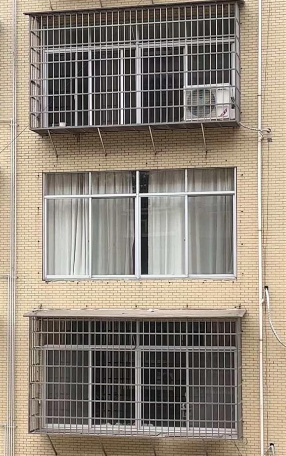 极目新闻记者观察发现,小区内数十上百个防护窗,几乎都是统一的样式。用来固定这些防护窗的,大都是打进四周墙壁内的膨胀螺丝,以及安装在防护窗下方的斜撑支架。根据防护窗的大小,每家每户选用的膨胀螺丝及斜撑支架的数量也不尽相同。比如,有些体型相对较小的防护窗,其下方只安装了2根斜撑支架,最多的安装了6根。