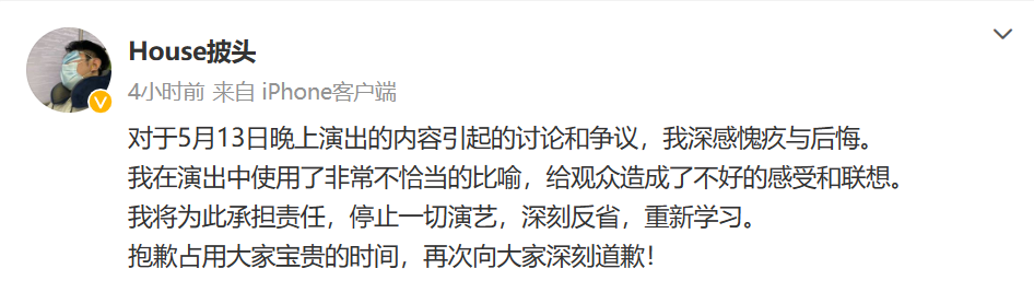 ▲House本人的道歉声明。