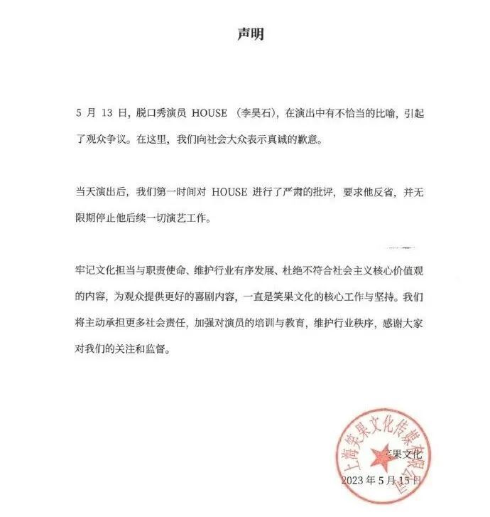 脱口秀演员House(李昊石)在13日的演出中使用了一个让人普遍感觉有辱人民子弟兵的“梗”,事情被曝光到网上后引起公众愤慨,并迅速发酵为公共舆论事件。House已于今日做出道歉,其所在笑果文化公司亦道歉,并表示无限期停止House的后续一切演出工作。