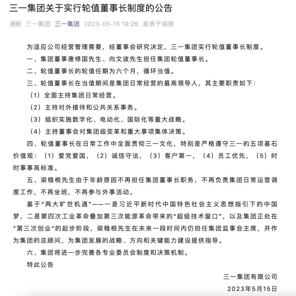 5月15日,三一集团发布关于实行轮值董事长制度的公告:为适应公司经营管理需要,经董事会研究决定,三一集团实行轮值董事长制度。集团董事唐修国、向文波担任集团轮值董事长。轮值董事长的轮值任期为六个月,循环当值。梁稳根由于年龄原因不再担任集团董事长职务,不再负责集团日常运营调度工作,不再坐班,不再参与外事活动。