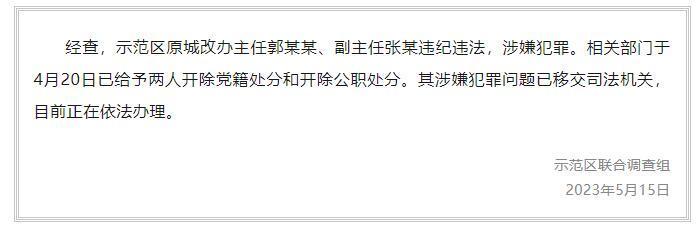 据《焦作日报》“高新区头条”公众号15日通报:经查,河南焦作市城乡一体化示范区原城改办主任郭某某、副主任张某违纪违法,涉嫌犯罪。相关部门于4月20日已给予两人开除党籍处分和开除公职处分。其涉嫌犯罪问题已移交司法机关,目前正在依法办理。