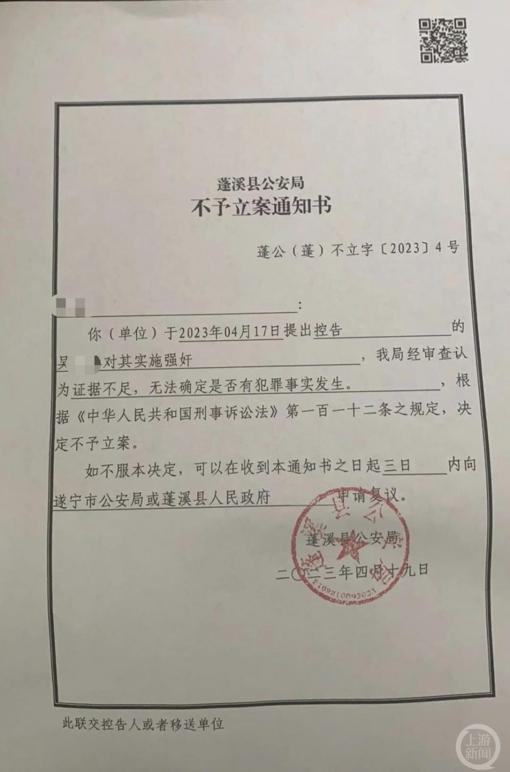 ▲蓬溪警方出具的不予立案通知书。图片来源/受访者供图