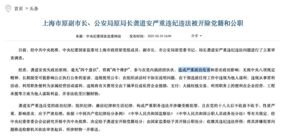 2021年2月被双开的上海市政府原党组成员、副市长,市公安局原党委书记、局长龚道安,通报中也提到了“造成严重政治危害”。