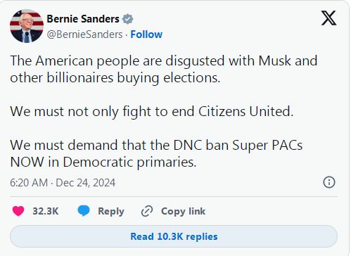 圣诞节前夜,桑德斯在X上表达了他对亿万富翁们在摇摆不定的选举中所扮演角色的担忧。他特别提到了马斯克,马斯克此前曾因巨额竞选捐款而受到批评。桑德斯写道:“美国人民厌恶马斯克和其他亿万富翁收买选举。我们不仅要为终结联合公民(Citizens United)而战。我们必须要求民主党全国委员会在民主党初选中立即禁止超级政治行动委员会。”