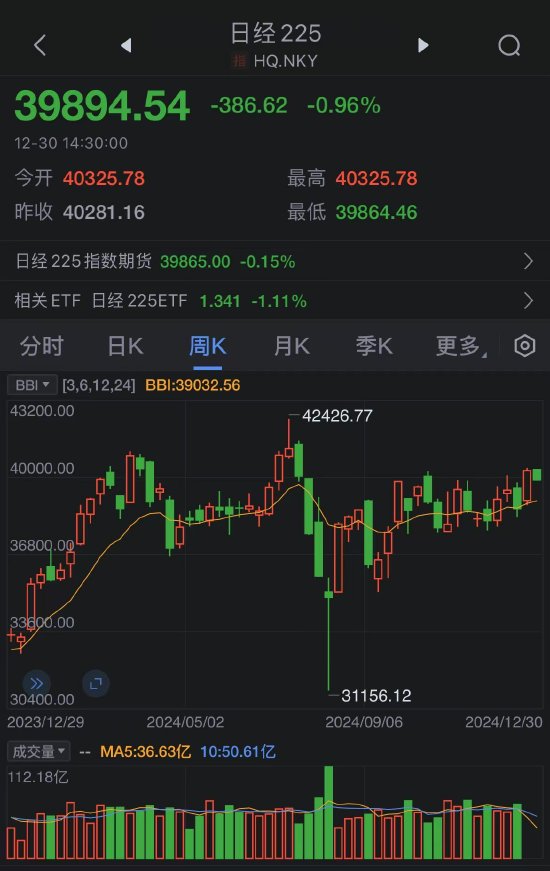 由于明日(12月31日)休市,今日为日本股市今年最后一个交易日。受日元走软和日本央行低利率政策的支撑,日经指数今年上涨了19.22%。2023年,该指数上涨了28%。