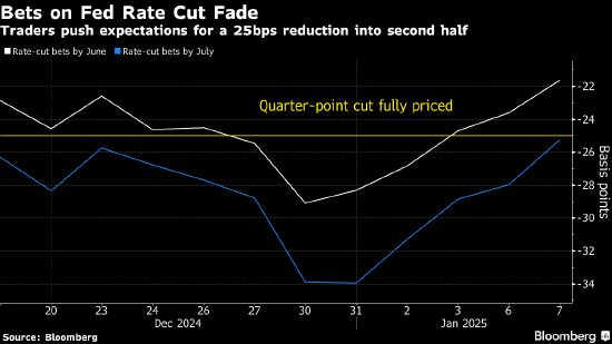 去年9月末,交易员们还笃定美联储会在3月前再次降息,如今他们放弃了对上半年降息一次的预期。