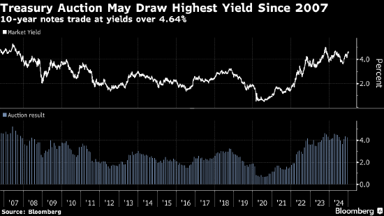 虽然10年期收益率在2023年末一度触及5%,但如果美东时间下午1点招标时中标收益率维持目前4.64%的市场水平,将是2007年8月以来新债最高收益率。