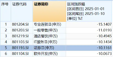 新年前后,A股突然转弱,券商作为行情风向标随市回调,数据显示,截至1月10日,券商板块年内累计下跌10.11%,在所有申万二级行业中位列倒数第五,与2024年4季度的强劲攻势形成鲜明反差。