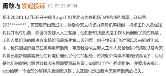 贺小姐投诉表示,2024年12月3日,自己在去哪儿网APP上购买1月9日北京大兴机场飞往永州的机票,订单金额为540元,页面显示出票成功。但是,在她去机场办理登机手续时,机场工作人员称并没有查询到她的机票。她咨询去哪儿网客服后,客服称应该是工作人员误删了其机票,并表示可以重新给她购买第二天的票。贺小姐认为,由于快到起飞时间,以及往返机场所需要时间很长,并且费用也不低,因此她只能被迫在机场重新购票,新票价为700多元。