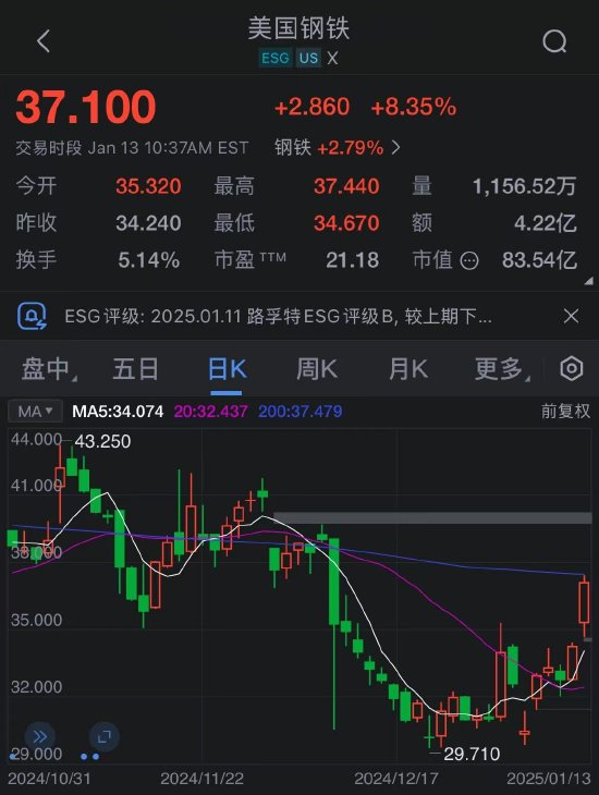 美国钢铁公司股价周一盘中上涨9.3%至一个月来最高水平。