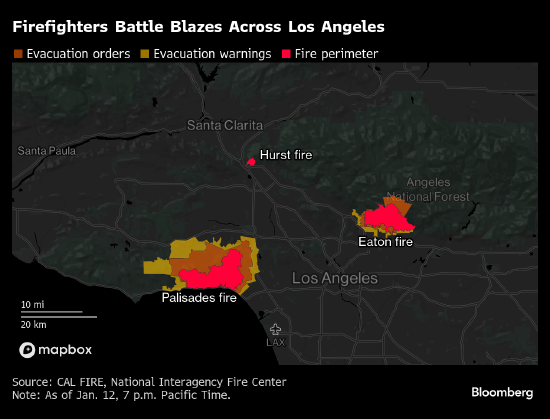 大风将限制消防员从地面和空中扑灭Palisades和Eaton大火的机会。Pacific Palisades和Altadena地区的大火已造成至少24人死亡,烧毁了超过40,000英亩土地上的12,000多栋建筑。