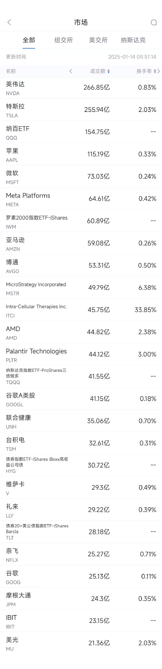 第9名Intra-Cellular Therapies收高34.07%,成交45.75亿美元。据报道,强生公司表示将以大约146亿美元的价格收购这家生物制药公司。