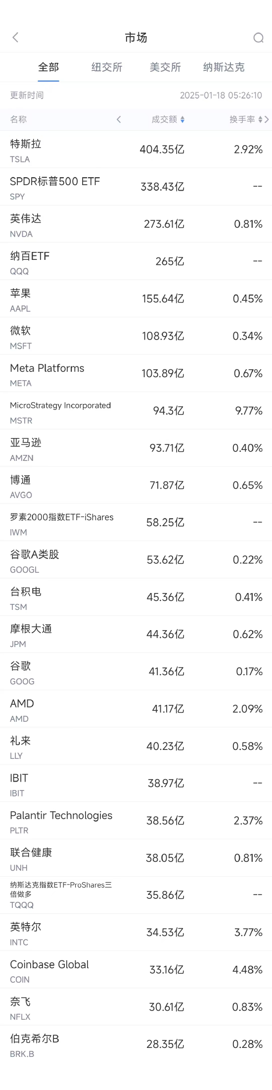 第17名英特尔收高9.25%,成交34.53亿美元。周五有报道称,这家陷入困境的芯片制造商成为收购目标。