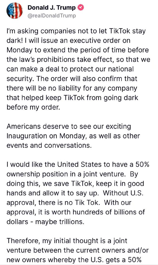 当地时间1月19日,美国当选总统特朗普在社交媒体发文称,将于周一(1月20日)发布一项行政命令,延长TikTok禁令法定生效前的时限。他还称,在行政命令下达前,任何协助TikTok避免关停的公司都无需承担责任。