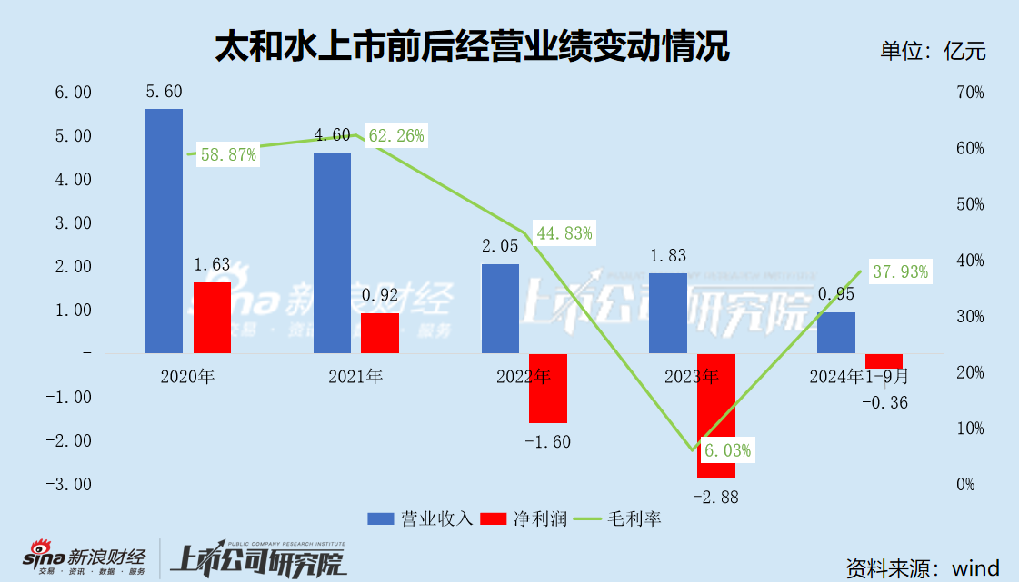 2024年1—9月,公司实现营业收入0.95亿元,同比下降12.67%;实现净利润-0.36亿元,同比增长35.09%。截至2024年9月,太和水未弥补亏损已达1.14亿元,归母净资产较上市首年减少了三成。