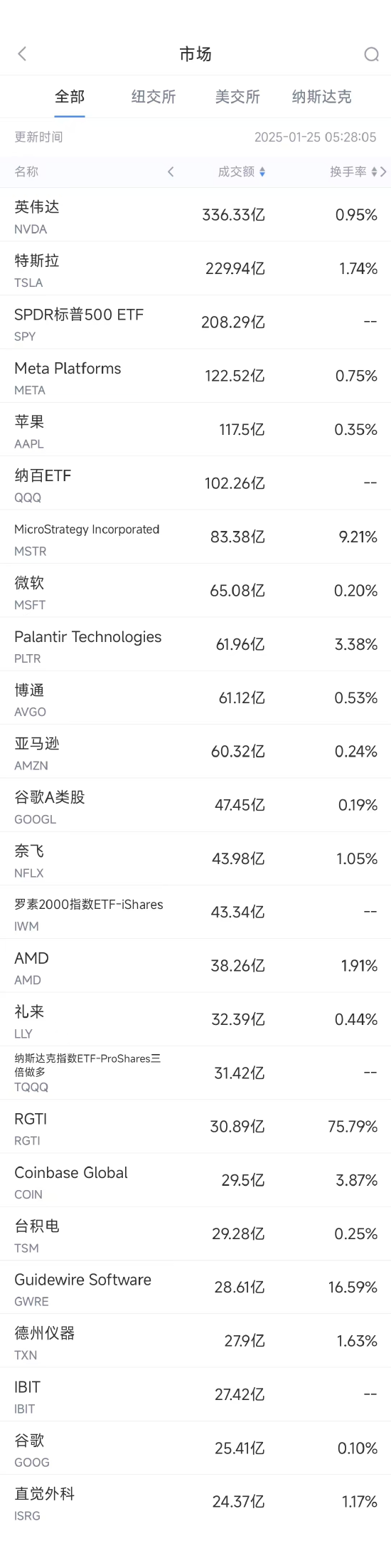第3名Meta Platforms收高1.73%,成交122.52亿美元。Meta Platforms公司CEO扎克伯格当地时间1月24日在社交平台Threads表示,将在2025年实现约1GW的在线计算,到年底Meta将拥有超过130万个GPU。Meta计划今年投资600亿至650亿美元用于资本支出,同时大幅发展人工智能团队。扎克伯格还称,“我们有资本在未来几年继续投资”。