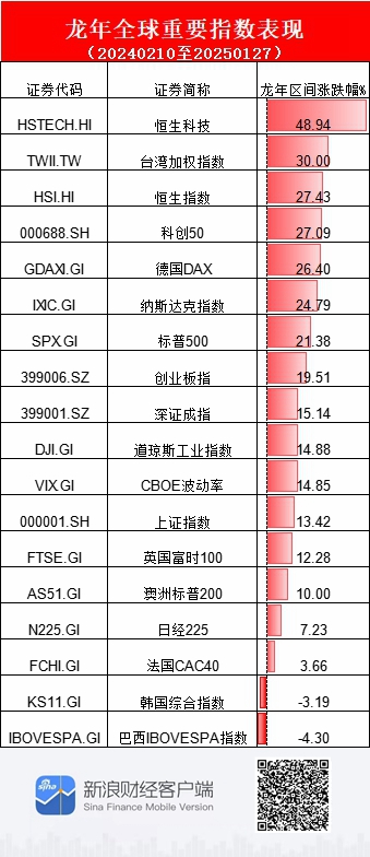 专题:春节特别策划:2025多元资产如何配置? 1月27日消息,龙年收官,数据显示,农历龙年期间(20240210至20250127),恒生科技指数涨幅近50%遥遥领先全球重要指数,科创50指数涨幅近30%位居前列,上证指数涨幅超13.42%。