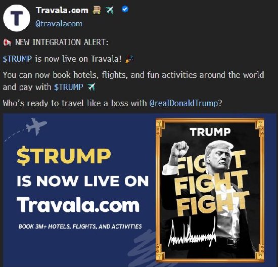 一些销售特朗普品牌产品的网站已经开始接受特朗普meme币支付,以争取更多的总统支持者。GetTrumpWatches.com、GetTrumpFragrances.com和GetTrumpSneakers.com——所有这些网站都有唐纳德·特朗普总统的品牌授权——现在允许客户使用特朗普币$Trump、信用卡和比特币结账。特朗普的“官方”meme币特朗普币$Trump于1月17日发布,特朗普并在社交媒体上对此进行了宣传。最近几天旅游网站Travala.com等其他企业也在开始接受特朗普币进行支付。