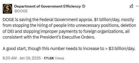 马斯克领导的美国政府效率部发贴称,它每天为美国节省约10亿美元。大部分通过停止雇用一些人,删除DEI和停止向外国组织支付不当款项来实现这一目标,所有这些都与特朗普的行政令保持一致。效率部称,这是一个良好开端,并称需要将节省数额提高到30亿美元/天以上。