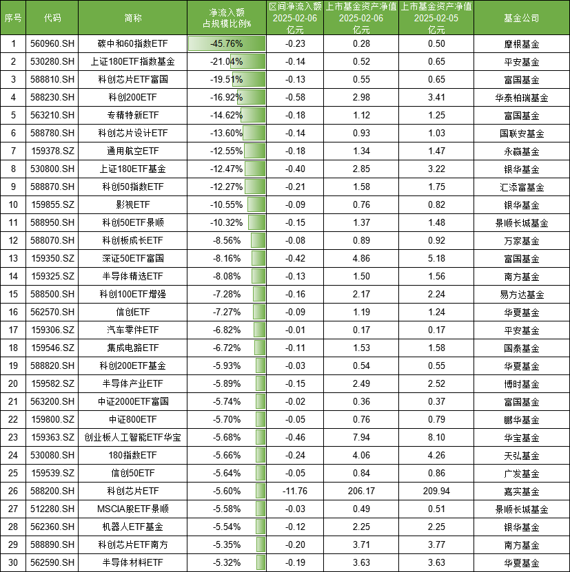 Wind数据显示,2月6日,摩根碳中和60指数ETF遭净赎回0.23亿元,最新规模0.28亿元,前一日规模为0.5亿元,当日资金净流出额占前一日规模的比例为45.76%,即一天被赎回超4成;