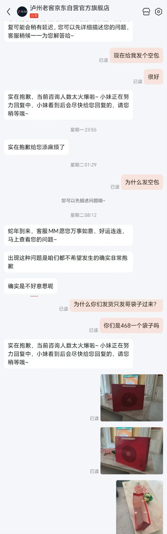 1月15日,湖南的蒋先生在泸州老窖京东自营官方旗舰店购买了两瓶酒,价值468元。商品详情页标明“次日达”,但是次日并没有发货。在他的催促下,1月31日店铺发货。但是,他在2月3号收到货的时候发现,说好的两瓶酒却变成了一个空袋子。