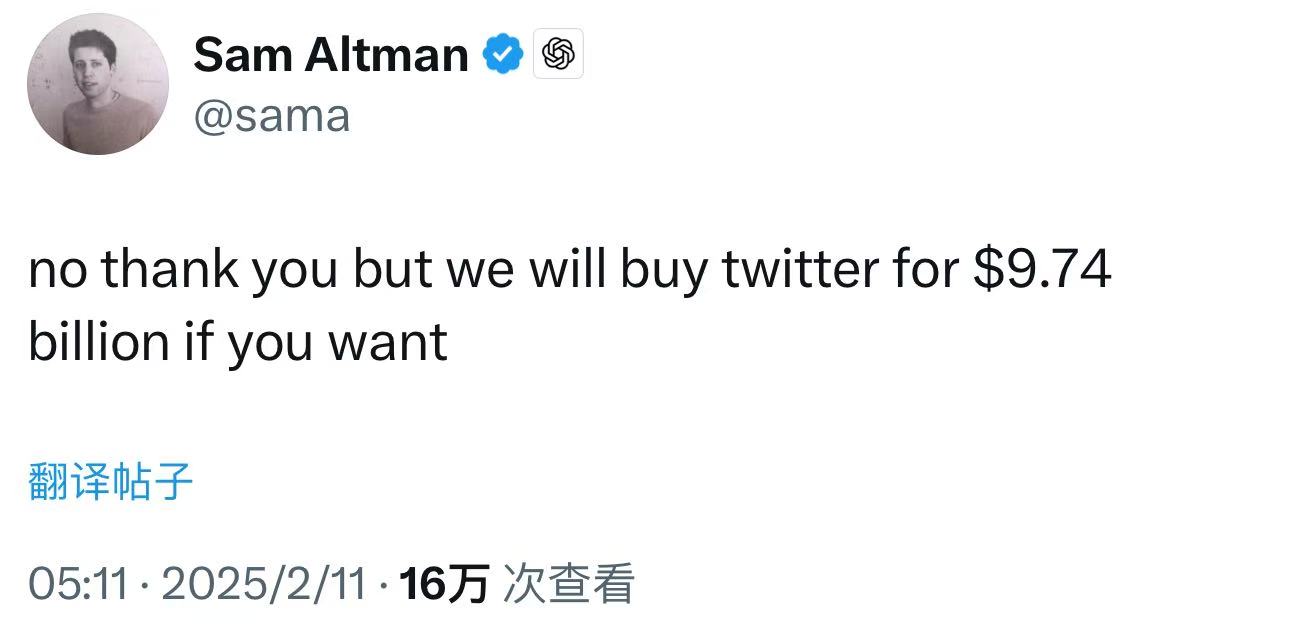 OpenAI创始人山姆·奥特曼回应称:“不,谢谢,但如果你(马斯克)愿意,我们将以97.4亿美元收购推特。”