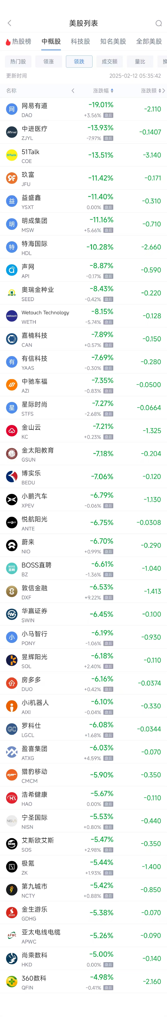 下跌股当中(按市值降序排列),京东跌3.25%,携程跌3.95%,百度跌4.70%,理想汽车跌4.93%,腾讯音乐跌0.24%,联电跌0.49%,中通跌3.71%,小鹏汽车跌6.79%,富途控股跌1.60%,满帮跌4.22%,中国新城农村跌0.44%,华住酒店集团跌0.33%,蔚来跌6.70%,WSP控股跌0.12%,唯品会跌1.63%,哔哩哔哩跌3.98%,名创优品跌4.65%,BOSS直聘跌6.61%,360数科跌4.98%,极氪跌5.44%,小马智行跌6.19%,文远知行跌0.56%,金山云跌7.21%。