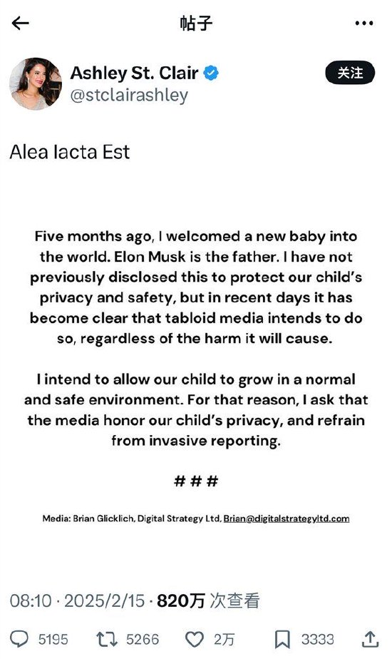 当地时间周五晚,美国31岁的女作家艾希莉·圣克莱尔在X上发帖称:“五个月前,我迎来了一个新生儿。埃隆·马斯克是孩子的父亲。”这段声明的标题是拉丁文“Alea lacta est”,意思是“木已成舟”。