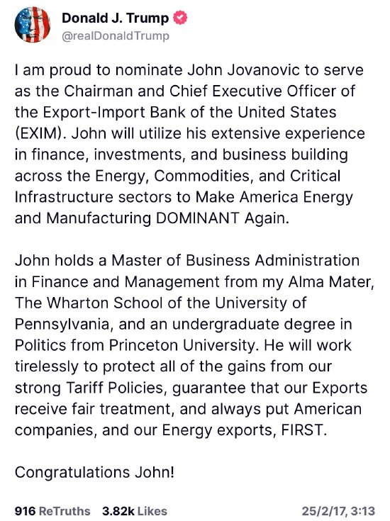 特朗普在 “真相社交” 平台上发帖称:“我很自豪地提名约翰・约万诺维奇担任美国进出口银行(EXIM)董事长兼首席执行官。约翰将利用他在能源、大宗商品和关键基础设施领域的金融、投资和企业建设方面的丰富经验,让美国的能源和制造业再次占据主导地位。”