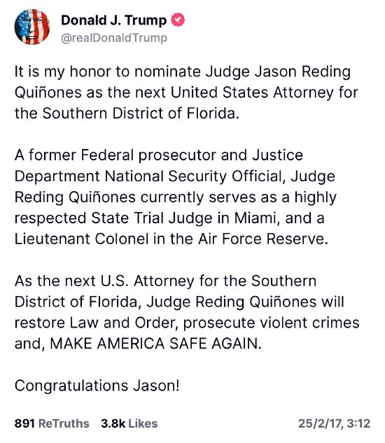 在另一篇帖子中,特朗普表示他提名法官贾森・雷丁・基尼奥内斯担任佛罗里达州南区联邦检察官,以 “恢复法律和秩序,起诉暴力犯罪,让美国再次安全”。
