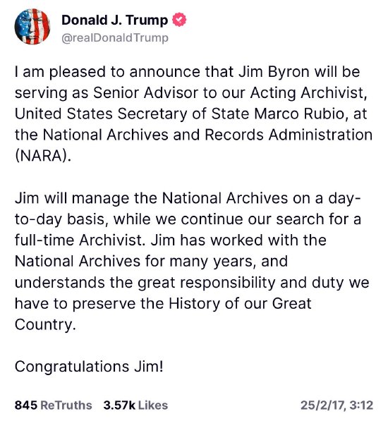 在上周特朗普政府在一次重大改组中迫使国家档案和记录管理局的高级领导层离职后不久,特朗普还宣布任命吉姆・拜伦为新的高级顾问,以帮助管理该机构。自该机构要求司法部调查特朗普卸任后对机密文件的不当处理以来,特朗普一直对该档案馆持高度批评态度。